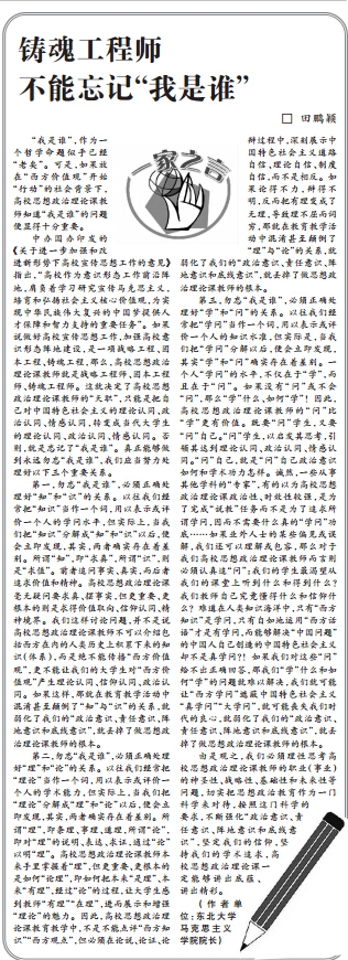 第三,勿忘“我是谁”,必须正确处理好“学”和“问”的关系。以往我们经常把“学问”当作一个词,用以表示或评价一个人的知识水准,但实际是,当我们把“学问”分解以后,便会立即发现,其实“学”和“问”确实存在着差别。一个人“学问”的水平,不仅在于“学”,而且在于“问”。如果没有“问”或不会“问”,那么“学”什么、如何“学”!因此,高校思想政治理论课教师的“问”比“学”更有价值。既要“问”学生,又要“问”自己。“问”学生,以启发其思考,引领其达到理论认同、政治认同、情感认同。“问”自己,就是“问”自己政治意识如何和学术功力怎样。诚然,一些从事其他学科的“专家”,有的以为高校思想政治理论课政治性、时效性较强,是为了完成“说教”任务而不是为了追求所谓学问,因而不需要什么真的“学问”功底……如果业外人士的某些偏见或误解,我们还可以理解或包容,那么对于我们高校思想政治理论课教师而言则必须认真追“问”:我们的学生最渴望从我们的课堂上听到什么和得到什么?我们教师自己究竟懂得什么和信仰什么?难道在人类知识海洋中,只有“西方知识”是学问,只有自如地运用“西方话语”才是有学问,而能够解决“中国问题”的中国人自己创造的中国特色社会主义却不是真学问?!如果我们对这些“问”给不出正确回答,那我们“学”什么和如何“学”的问题就难以解决,我们就可能让“西方学问”遮蔽中国特色社会主义“真学问”“大学问”,就可能丧失我们时代的良心,就弱化了我们的“政治意识、责任意识、阵地意识和底线意识”,就丢掉了做思想政治理论课教师的根本。