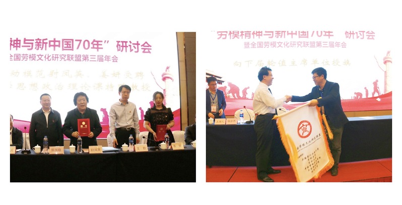 会上,东北大学聘请全国劳动模范蔚凤英、姜妍为东北大学思想政治理论课特聘教授,并向她们颁发聘书。全国劳模文化研究联盟确定吉林大学为联盟第四届轮值主席单位并向其授旗。