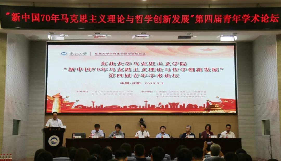 为庆祝中华人民共和国成立70周年,回顾总结新中国成立70年以来马克思主义理论和哲学发展的历史进程、重要成果、伟大成就和基本经验,深入学习贯彻党的十九大精神和习近平新时代中国特色社会主义思想,促进青年学子之间的交流和成长,9月1日,由中共东北大学党委研究生工作部、马克思主义学院主办的“新中国70年马克思主义理论与哲学创新发展”第四届青年学术论坛在东北大学举行。来自北京大学、中国人民大学、复旦大学、浙江大学、吉林大学、哈尔滨工业大学、西安交通大学、东北大学等近30余所高校的60余名优秀研究生共聚一堂,深入学习研讨“新中国70年马克思主义理论与哲学创新发展”。东北师范大学马克思主义学部副部长段妍、辽宁大学哲学与公共管理学院院长王国坛、东北大学研究生院副院长兼党委研究生工作部部长丁义浩教授、东北大学马克思主义学院院长田鹏颖教授,东北大学马克思主义学院党委书记张满胜、马克思主义学院副院长王健教授、马克思主义学院副院长任鹏教授、马克思主义学院党委副书记兼副院长吕昫光等出席论坛。开幕式由东北大学马克思主义学院副院长任鹏教授主持。