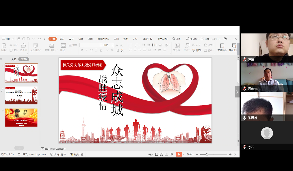 2020年3月6日下午,在全国抗击疫情的特殊时期,马克思主义学院机关党支部用一种特殊的形式——视频会议,开展了“众志成城,战胜疫情”支部主题党日活动。学院副院长任鹏和思想政治教育系教师张小秋受邀讲授党课。活动由机关党支部书记高青主持。