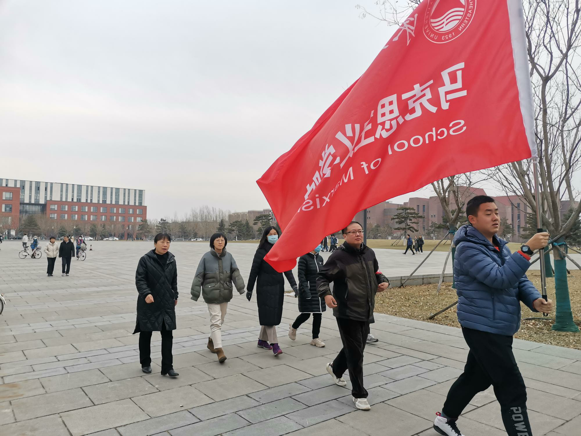 纪念“一二.九”运动八十六周年,12月9日中午一点东北大学举行了“信息杯”教职工健步行活动。马克思主义学院积极动员,组成党委书记张满胜等9位老师的代表团,分别参加在南湖校区、浑南校区的活动。在当天的开幕式上,马克思主义学院代表团精心准备,现场表演学生编排的舞蹈《我们都是逐梦人》。随后,代表团从图书馆南广场出发,按照划定路线走完全程,完成健步行活动,充分展现了学院教职工的良好风貌。