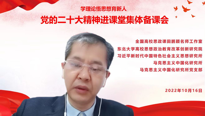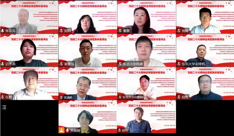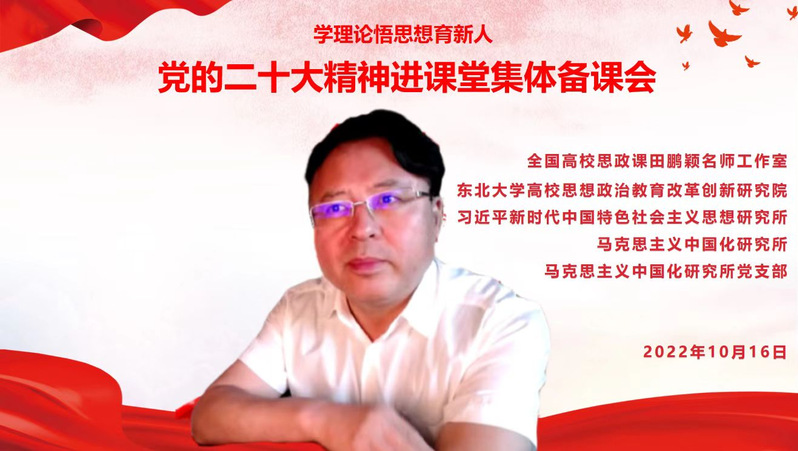 2022年10月16日,由全国高校思政课田鹏颖名师工作室、东北大学高校思想政治教育改革创新研究院、习近平新时代中国特色社会主义思想研究所、马克思主义中国化研究所、马克思主义中国化研究所党支部举办的“党的二十大精神进课堂集体备课会”在线上召开,东北大学马克思主义学院院长田鹏颖、党委书记张满胜、副院长任鹏,以及《毛泽东思想和中国特色社会主义理论体系概论》《习近平新时代中国特色社会主义思想概论》课程组全体教师参加。集体备课会由马克思主义中国化研究所所长朱丽颖主持。