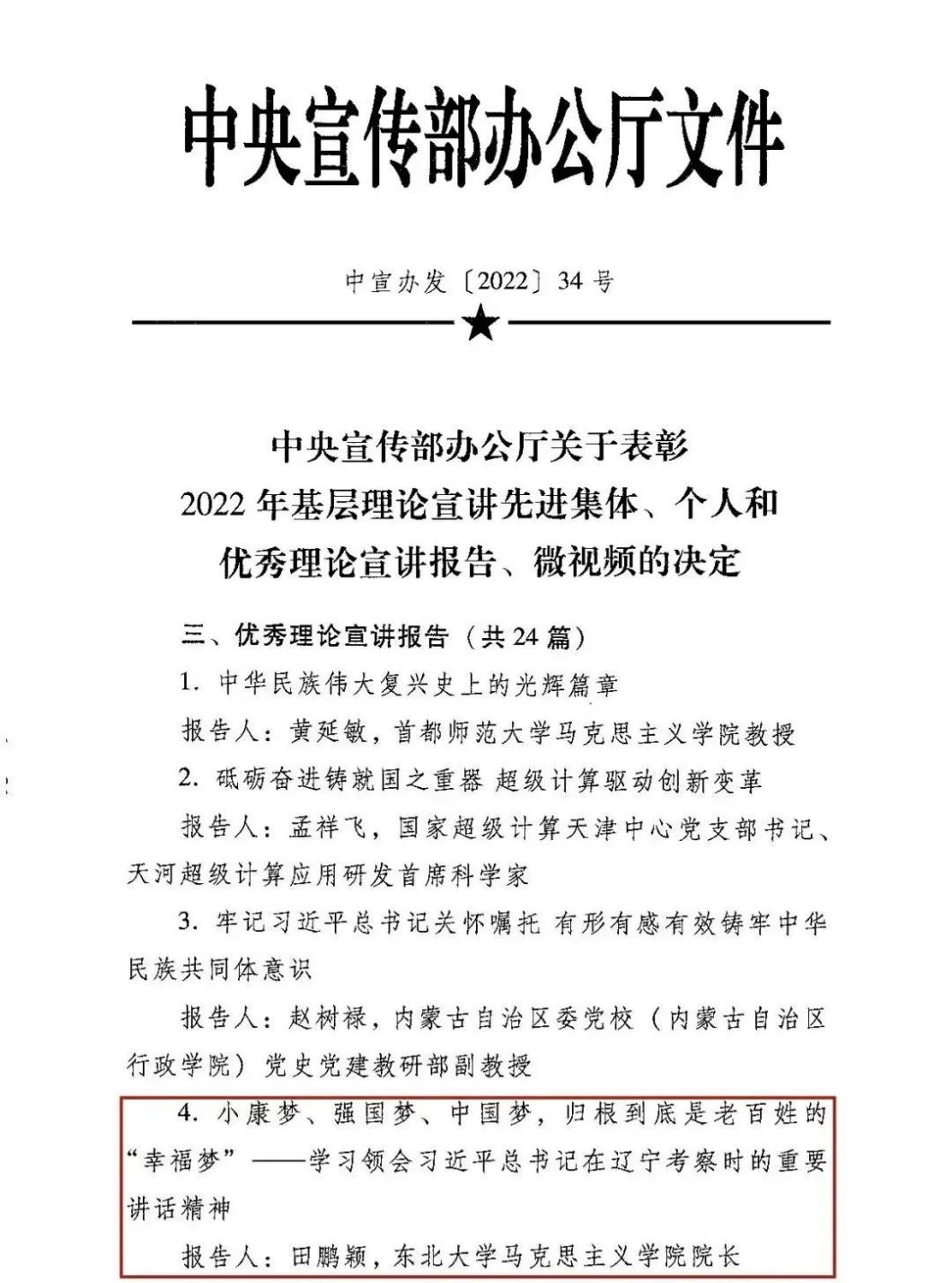 10月20日,中央宣传部办公厅公布了《关于表彰2022年基层理论宣讲先进集体、个人和优秀理论宣讲报告、微视频的决定》,东北大学马克思主义学院院长田鹏颖教授所作的《小康梦、强国梦、中国梦,归根到底是老百姓的“幸福梦”——学习领会习近平总书记在辽宁考察时的重要讲话精神》报告成功入选“优秀理论宣讲报告”。