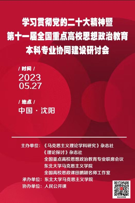 为深入学习贯彻习近平新时代中国特色社会主义思想、党的二十大精神,落实立德树人根本任务,聚焦新时代思想政治教育本科专业建设,探讨新时代思想政治教育本科专业高质量发展问题,提升思想政治教育实效,培养全面发展的社会主义建设者和接班人,受全国重点高校思想政治教育专业联席会议委托,东北大学拟定于5月27日全天召开第十一届全国重点高校思想政治教育本科专业协同建设研讨会,人民公开课直播平台全程直播,欢迎各位专家学者和广大高校师生扫描海报二维码收看直播,共同参与本次论坛!
