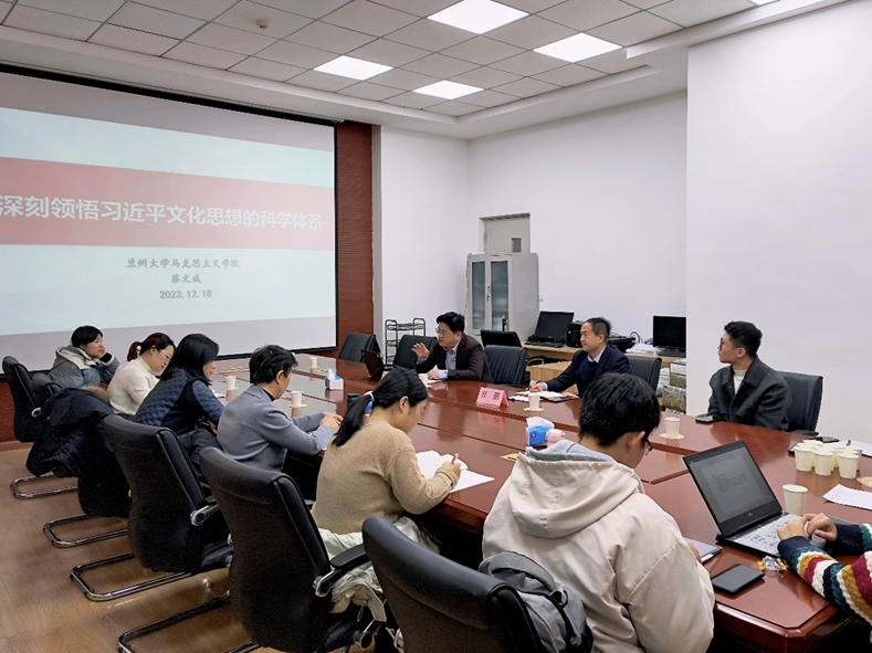 为深入学习贯彻习近平新时代中国特色社会主义思想,12月18日,马克思主义学院邀请兰州大学马克思主义学院院长蔡文成教授做客“理论中国”大讲堂,作了题为《深刻领悟习近平文化思想的科学体系》的报告。马克思主义学院院长任鹏及学院师生代表参加了报告会。任鹏院长主持报告会。