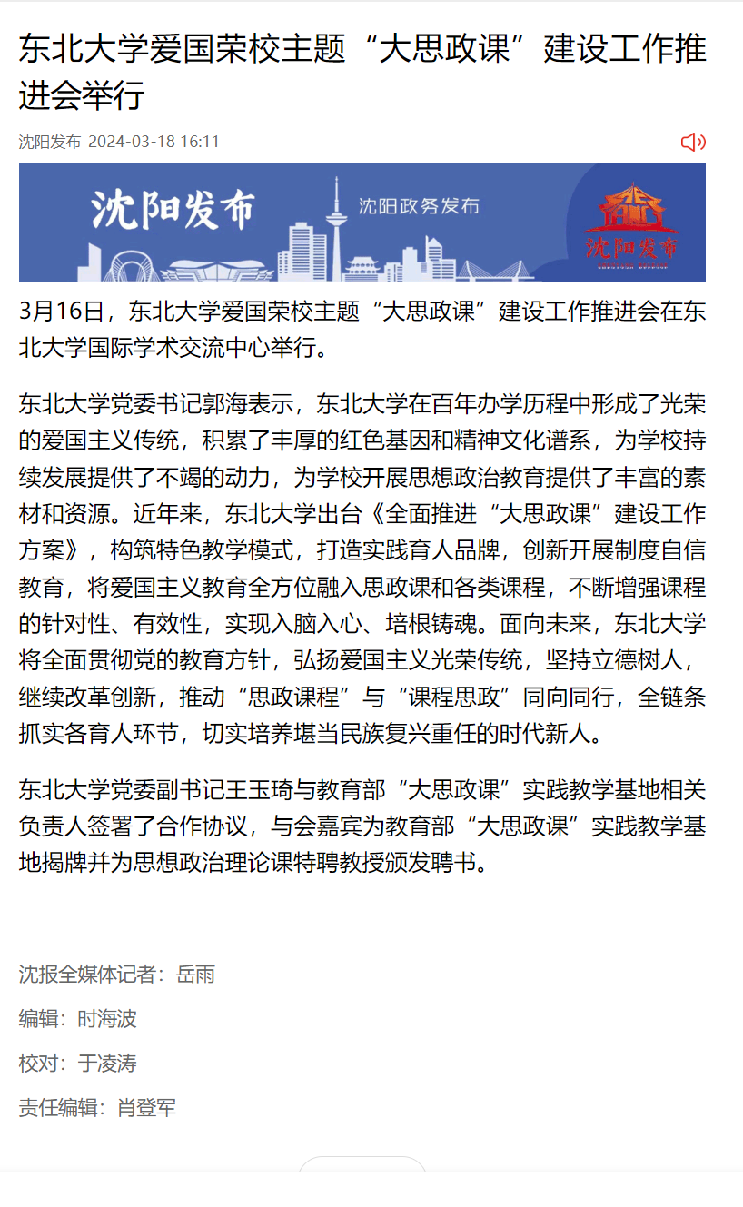 3月16日,东北大学爱国荣校主题“大思政课”建设工作推进会在东北大学国际学术交流中心举行。