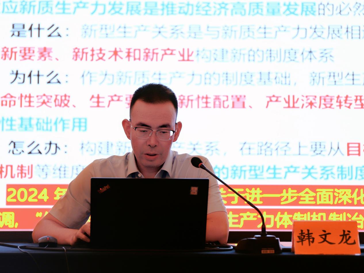 西南财经大学经济学院副院长韩文龙教授作题为《构建与新质生产力相适应的新型生产关系的理论内涵和实践路径》的主题发言。他深入阐释了新型生产关系的内涵、新型生产关系是新质生产力的制度基础、以全面深化改革构建新型生产关系框架等问题。他指出,新型生产关系在推进新质生产力的技术革命性突破、生产要素创新性配置、产业深度转型升级、绿色发展等方面发挥着制度性基础作用,要从目标导向、改革路径设计、改革实现机制等维度出发,搭建有效的新型生产关系制度框架,促进新质生产力加快发展。