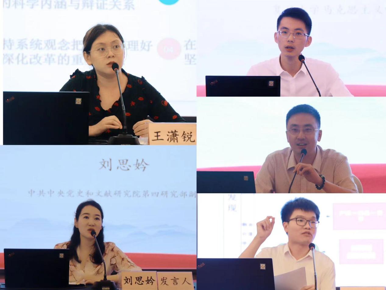 中共中央党史和文献研究院第四研究部王潇锐副研究员、中共中央党史和文献研究院第四研究部刘思妗副研究员、复旦大学马克思主义学院包炜杰副教授、中国社会科学院哲学研究所韩蒙副研究员、北京航空航天大学马克思主义学院巩永丹副教授分别作题为“以坚持系统观念推进全面深化改革”“中国式现代化视域下的‘人民至上’价值理念探析”“‘高质量发展’的历史唯物主义阐释”“‘社会主义现代化’的唯物史观根据”“唯物史观视野下中国式现代化理论的逻辑架构”的发言。