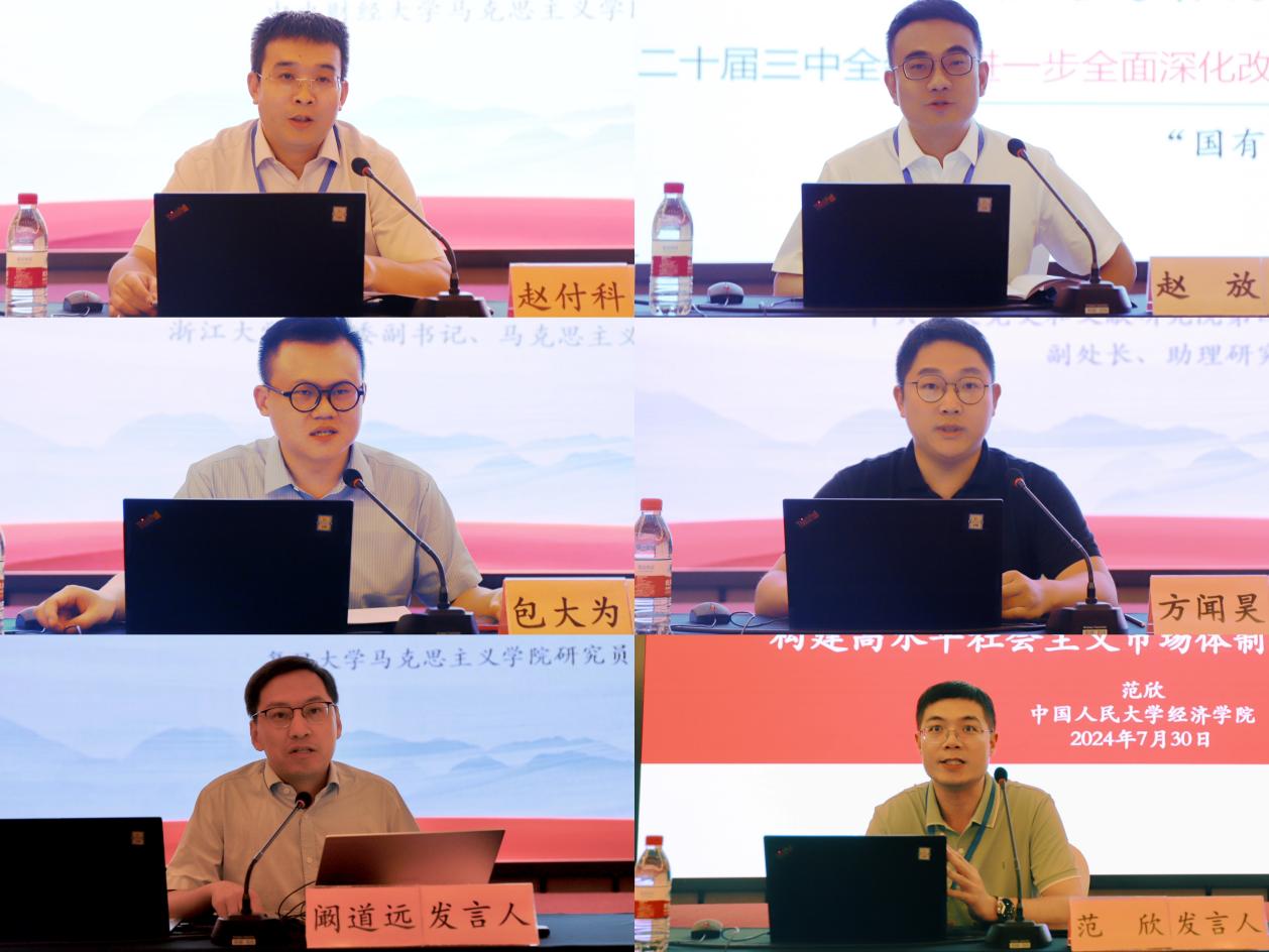 中央财经大学马克思主义学院赵付科教授,吉林大学绿色金融与碳中和创新实验室常务副主任、吉林省文旅教育与文旅产业研究中心主任、吉林大学经济学院赵放教授,浙江大学校团委副书记、马克思主义学院包大为研究员,中共中央党史和文献研究院第四研究部编辑一处副处长、方闻昊助理研究员,复旦大学马克思主义学院阚道远研究员,中国人民大学全国中国特色社会主义政治经济学研究中心副主任范欣副教授分别作题为“进一步全面深化改革必须坚持正确的方法论”“中央企业引领发展新质生产力的核心要义与实践导向”“中国式现代化:世界百年未有之大变局的关键变量”“以新发展理念引领进一步全面深化改革”“党领导中国式现代化的基本逻辑”“要素市场化配置改革:构建高水平社会主义市场经济体制的重要抓手”的发言。