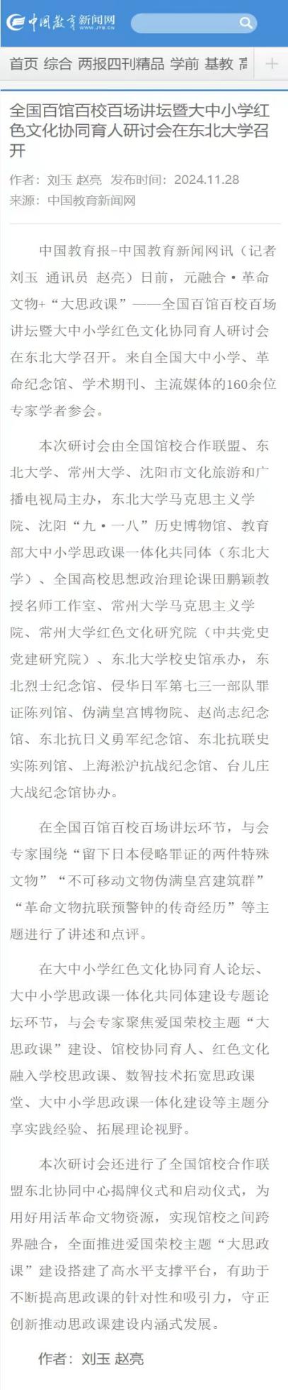 中国教育报-中国教育新闻网讯 日前,元融合·革命文物+“大思政课”——全国百馆百校百场讲坛暨大中小学红色文化协同育人研讨会在东北大学召开。来自全国大中小学、革命纪念馆、学术期刊、主流媒体的160余位专家学者参会。