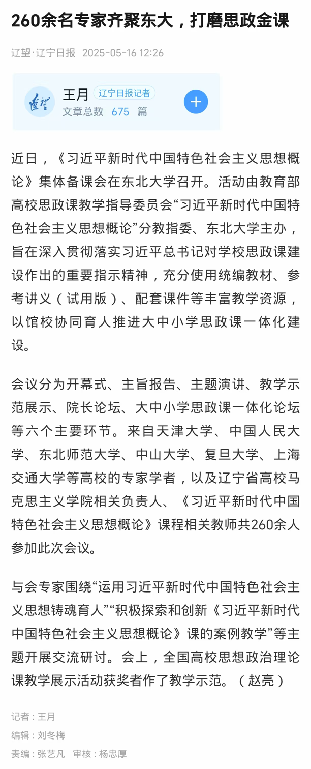 近日,《习近平新时代中国特色社会主义思想概论》集体备课会在东北大学召开。活动由教育部高校思政课教学指导委员会“习近平新时代中国特色社会主义思想概论”分教指委、东北大学主办,旨在深入贯彻落实习近平总书记对学校思政课建设作出的重要指示精神,充分使用统编教材、参考讲义(试用版)、配套课件等丰富教学资源,以馆校协同育人推进大中小学思政课一体化建设。