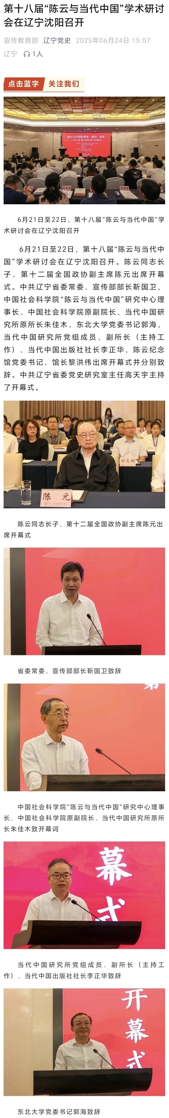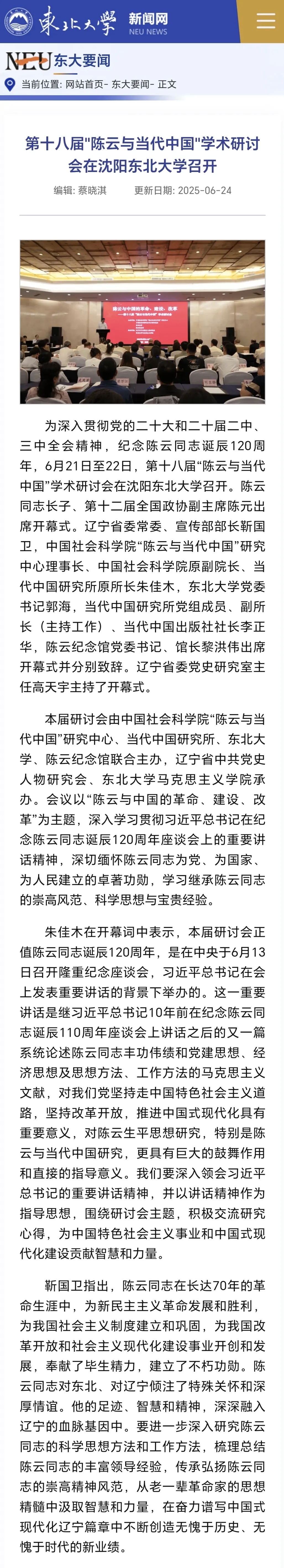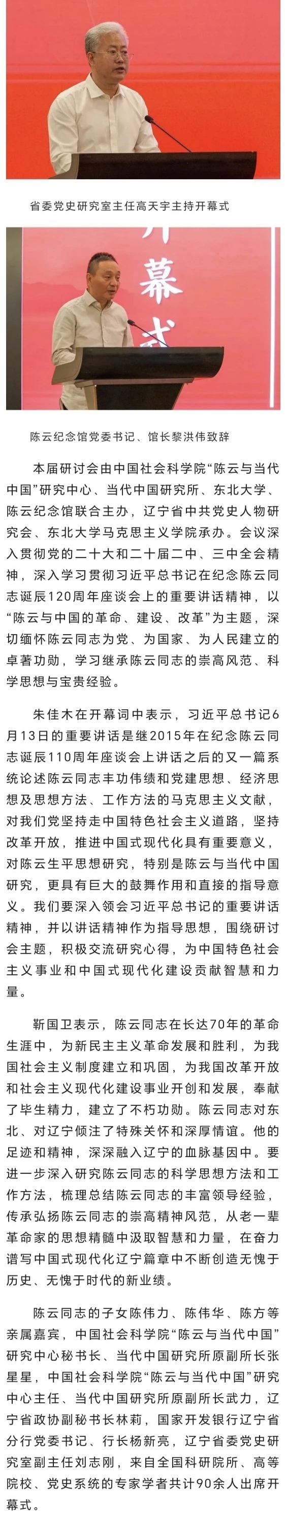 6月21日至22日,由中国社会科学院“陈云与当代中国”研究中心、当代中国研究所、东北大学、陈云纪念馆联合主办,辽宁省中共党史人物研究会、东北大学马克思主义学院承办的第十八届“陈云与当代中国”学术研讨会顺利举行。本次研讨会受到光明日报、中国教育报等多家主流媒体关注报道。