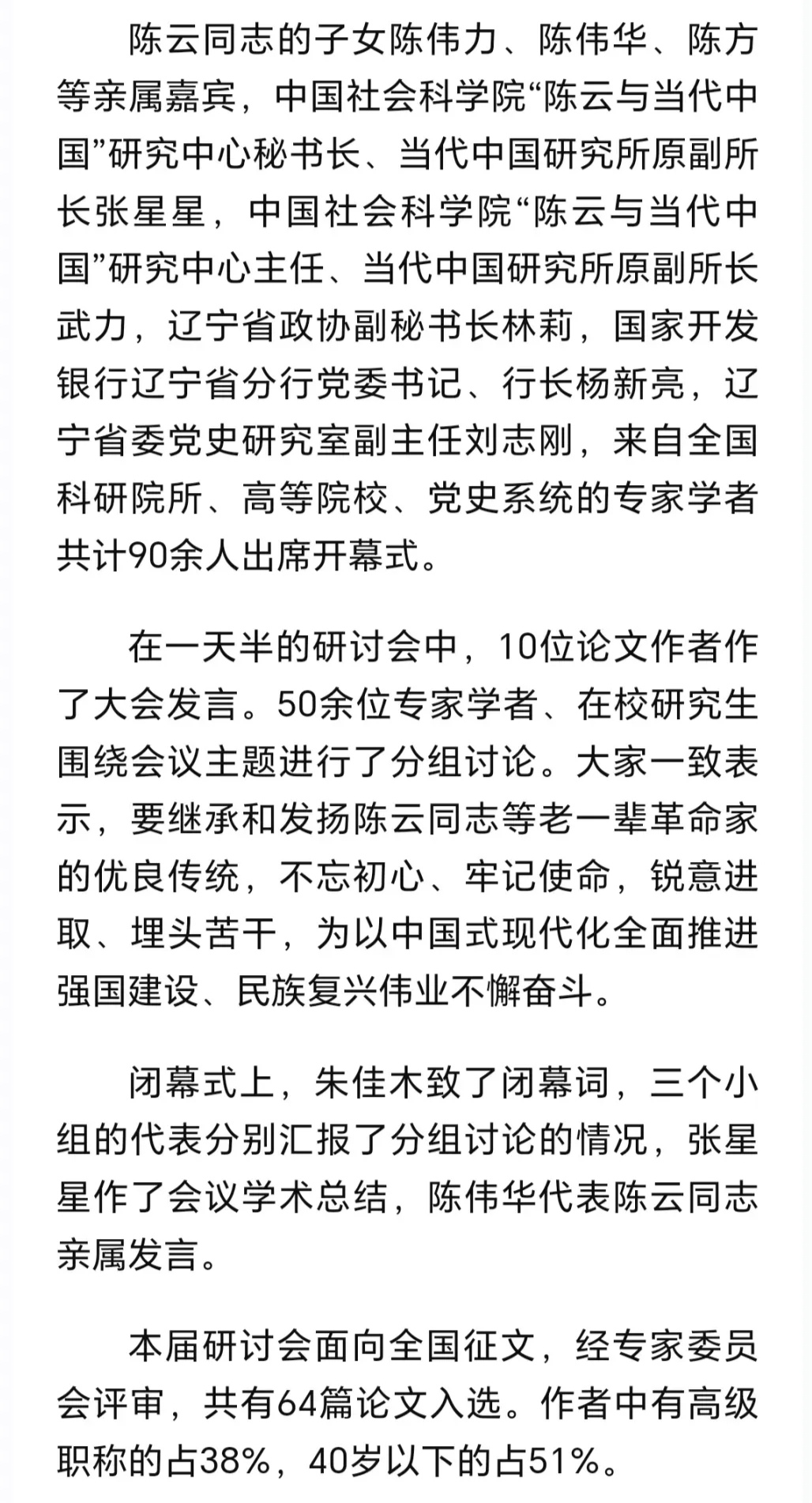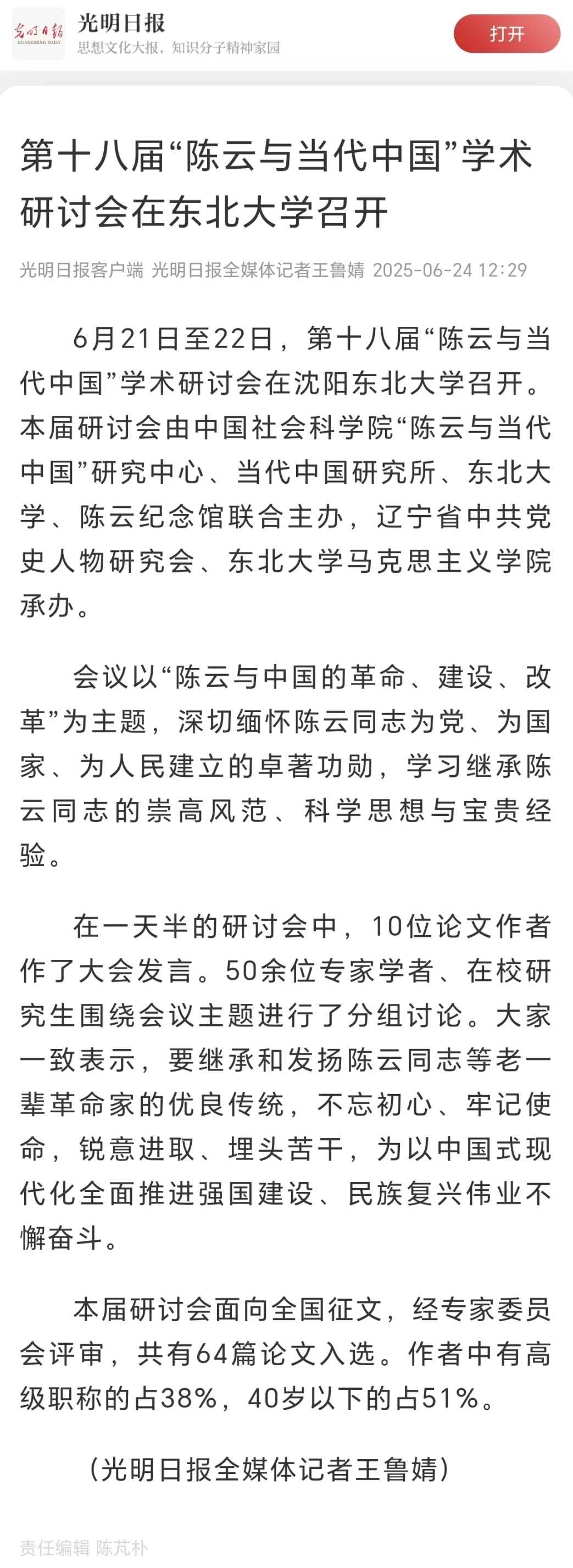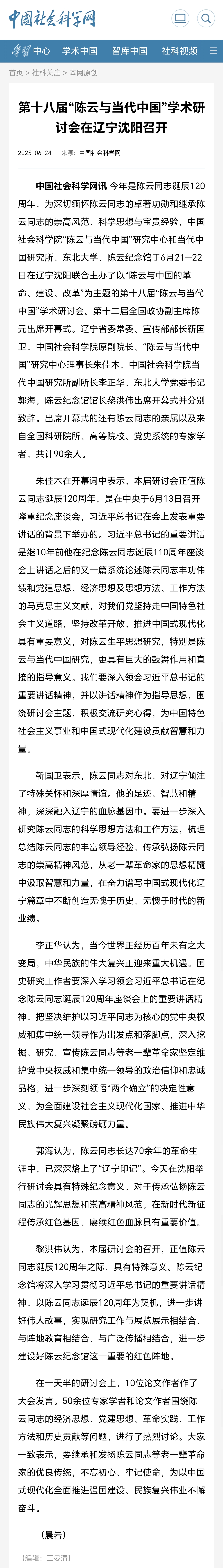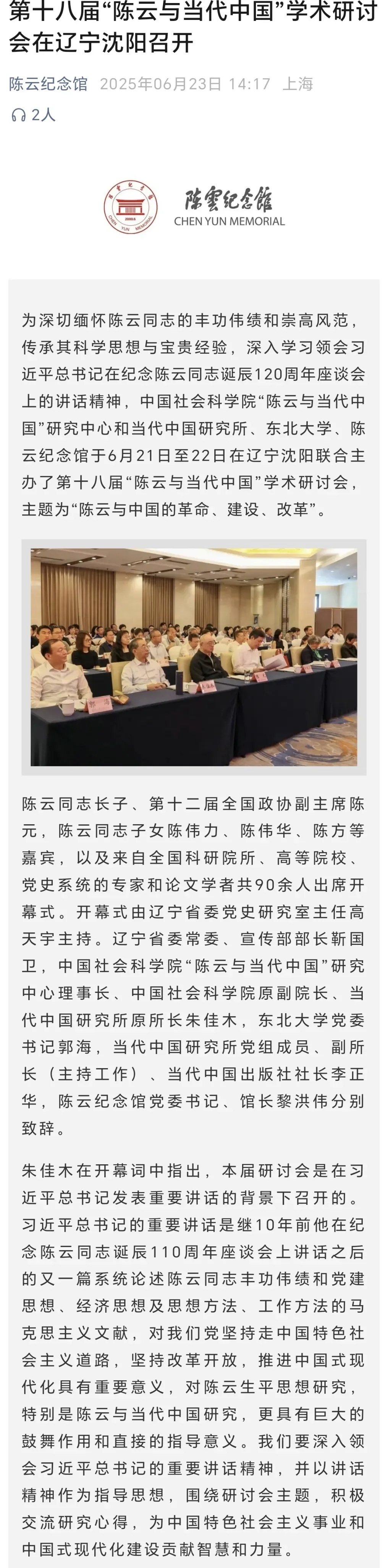 6月21日至22日,由中国社会科学院“陈云与当代中国”研究中心、当代中国研究所、东北大学、陈云纪念馆联合主办,辽宁省中共党史人物研究会、东北大学马克思主义学院承办的第十八届“陈云与当代中国”学术研讨会顺利举行。本次研讨会受到光明日报、中国教育报等多家主流媒体关注报道。