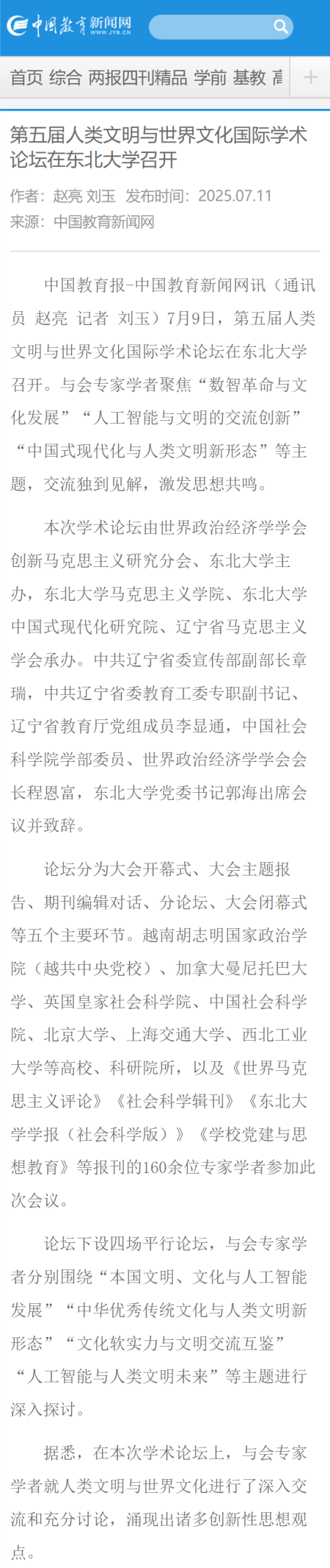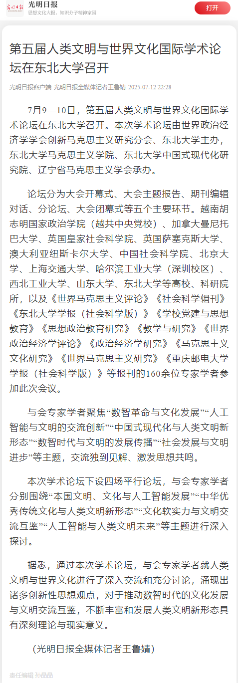 7月9-10日,由世界政治经济学学会创新马克思主义研究分会、东北大学主办,东北大学马克思主义学院、东北大学中国式现代化研究院、辽宁省马克思主义学会承办的第五届人类文明与世界文化国际学术论坛顺利举行。本次研讨会受到光明日报、中国教育报等多家主流媒体关注报道。