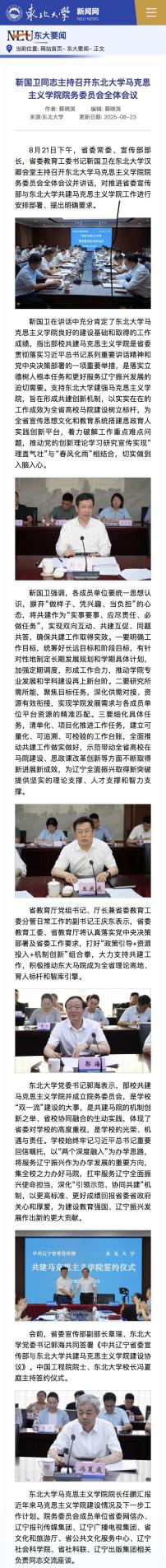 8月21日下午,省委常委、宣传部部长,省委教育工委书记靳国卫在东北大学汉卿会堂主持召开东北大学马克思主义学院院务委员会全体会议并讲话,对推进省委宣传部与东北大学共建马克思主义学院工作进行安排部署、提出明确要求。