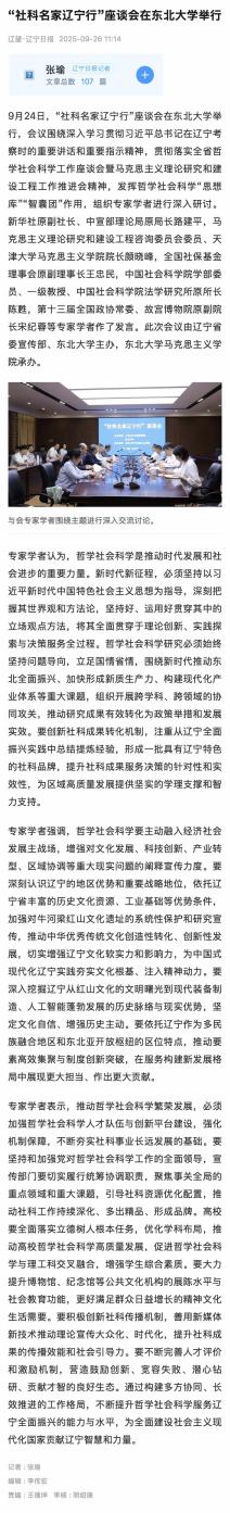9月24日,“社科名家辽宁行”座谈会在东北大学举行,会议围绕深入学习贯彻习近平总书记在辽宁考察时的重要讲话和重要指示精神,贯彻落实全省哲学社会科学工作座谈会暨马克思主义理论研究和建设工程工作推进会精神,发挥哲学社会科学“思想库”“智囊团”作用,组织专家学者进行深入研讨。新华社原副社长、中宣部理论局原局长路建平,马克思主义理论研究和建设工程咨询委员会委员、天津大学马克思主义学院院长颜晓峰,全国社保基金理事会原副理事长王忠民,中国社会科学院学部委员、一级教授、中国社会科学院法学研究所原所长陈甦,第十三届全国政协常委、故宫博物院原副院长宋纪蓉等专家学者作了发言。此次会议由辽宁省委宣传部、东北大学主办,东北大学马克思主义学院承办。
