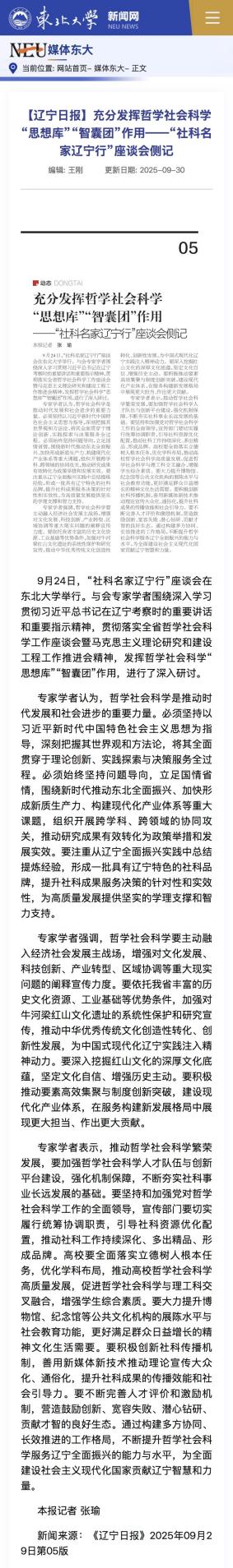 9月24日,“社科名家辽宁行”座谈会在东北大学举行。与会专家学者围绕深入学习贯彻习近平总书记在辽宁考察时的重要讲话和重要指示精神,贯彻落实全省哲学社会科学工作座谈会暨马克思主义理论研究和建设工程工作推进会精神,发挥哲学社会科学“思想库”“智囊团”作用,进行了深入研讨。