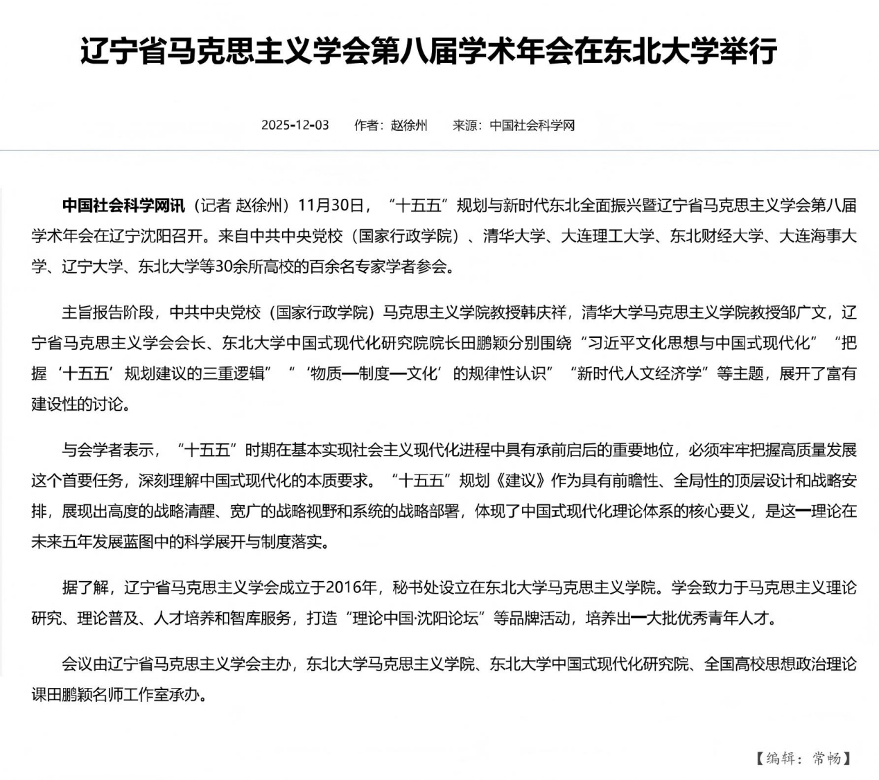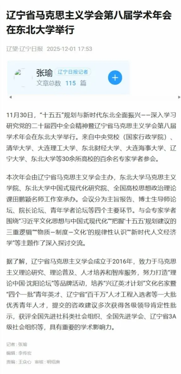 11月30日,由辽宁省马克思主义学会主办,东北大学马克思主义学院、东北大学中国式现代化研究院、全国高校思想政治理论课田鹏颖名师工作室承办的“十五五”规划与新时代东北全面振兴——深入学习研究党的二十届四中全会精神暨辽宁省马克思主义学会第八届学术年会顺利举行。本次会议受到光明日报、中国社会科学报、辽宁日报等多家主流媒体关注报道。