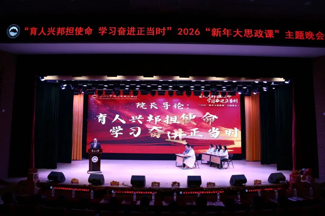据悉,本次“新年大思政课”主题晚会以“育人兴邦担使命 学习奋进正当时”为主题,联动沈阳市大东区、浑南区新时代文明实践中心,通过理论宣讲、文艺展演、成果展示等形式,为师生呈现了一场兼具思想深度与情感温度的思政大课。晚会分“以文化人以文育人”“格物致知铸魂育人”“时代之问青春作答”“强国复兴东大有我”四个篇章,东北大学马克思主义中国化研究所赵亮,浑南区新时代文明实践中心袁正、东北大学马克思主义学院思想政治教育系温惠淇为在场师生讲授思政课,学院2025级硕士研究生王晨阳作主题宣讲。文艺节目涵盖舞剧《诗吟》、器乐演唱《赤伶》、合唱《灯火里的中国》《有我》、小品《选择》等,穿插“我想在东大马院做的一百件美好小事”分享,让思政教育在潜移默化中入脑入心。